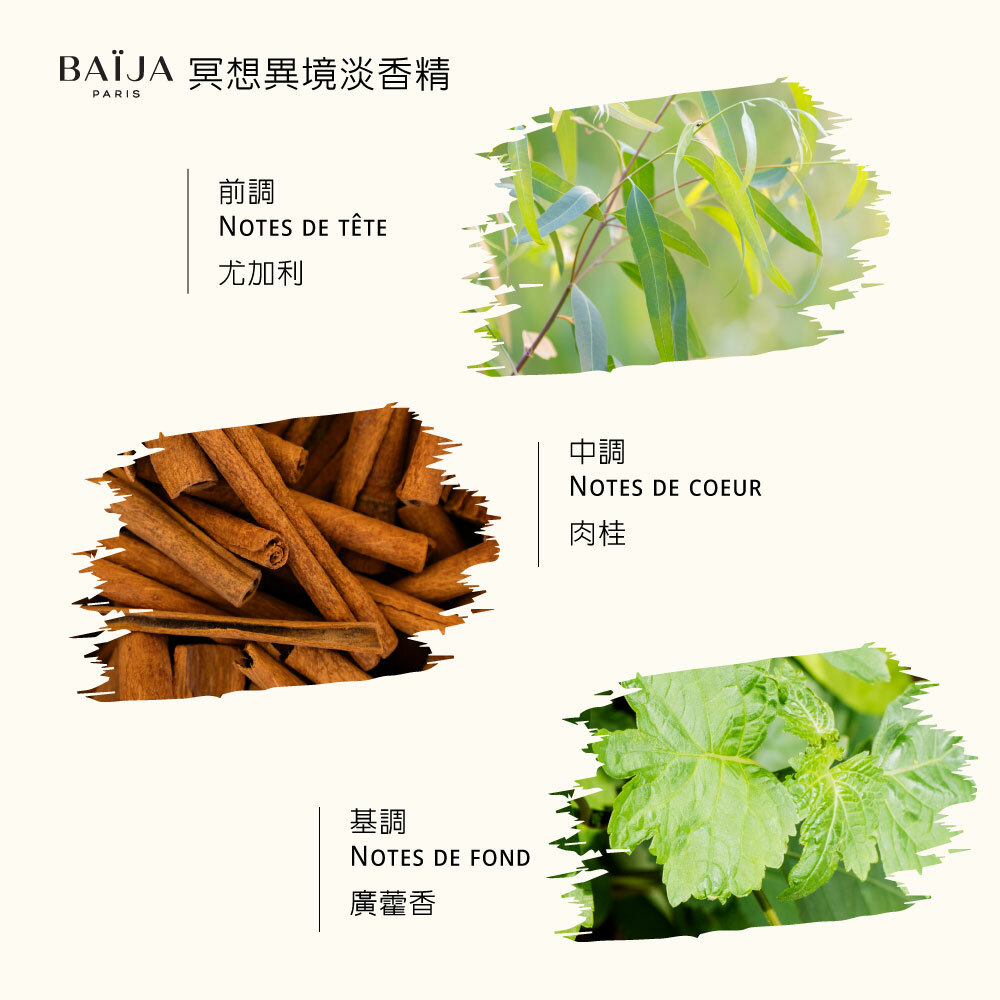 百嘉冥想異境淡香精,前調: 尤加利、中調: 肉桂、基調: 廣藿香,在與天地溝通的儀式中,尤加利淨化身心的香氣,與肉桂些微香甜的辛辣,被廣藿香的優雅與神祕所包覆縈繞。淡香精屬於持香度較高的香水,能持香一整天。