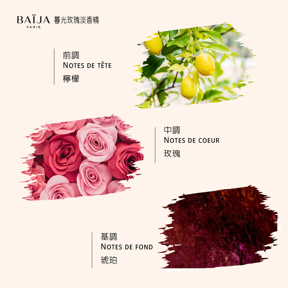 百嘉暮光玫瑰 淡香精 15ML,前調: 檸檬、中調: 玫瑰、基調: 琥珀。清新調美女必備,檸檬恰到好處的微甜,讓人為之振奮的清新,自帶女神系光環,絕對不會出錯的浪漫調玫瑰,搭配沉穩的琥珀,香氣的層次如同女神般難以輕易一探究竟。淡香精屬於持香度較高的香水,能持香一整天。