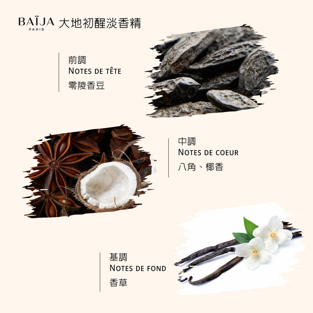 百嘉大地初醒淡香精 ,前調: 零陵香豆、中調: 八角、椰香、基調: 香草、檀香。一品前所未有的絕美香氣: 人稱香氣毒藥的零陵香豆,開啟了人類對於香氣的初始渴望,荳蔻的草本混合著淡淡的巧克力與香草的香氣,還帶著點茉莉花的複雜香氣,伴隨著香甜的椰香與辛辣的八角,讓味覺產生了質地層次的變化,木質的檀香總能讓人感到療癒與安撫。淡香精(Eau de Parfum)持香度高,能維持一整天。