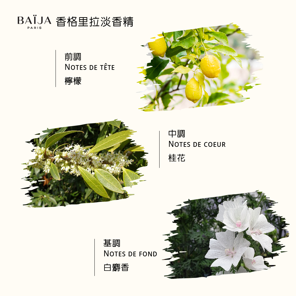 百嘉 香格里拉(Eau de Yunnan) 淡香精,前調: 檸檬、中調: 桂花、基調: 白麝香在消失的地平線: 雲南香格里拉巧遇,遠望著神山喜馬拉雅山瀰漫著縹緲的仙氣,清新而淡雅的檸檬,搭配著春天優雅而細緻的桂花香氣,餘韻中散發著白麝香的微甜性感。