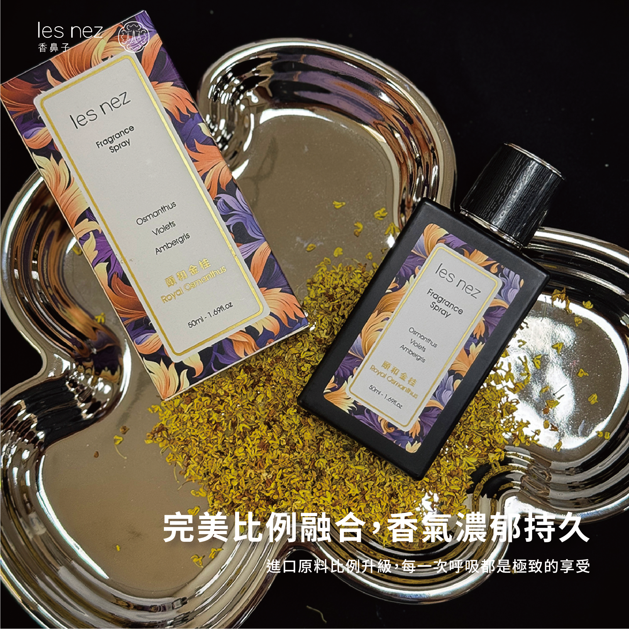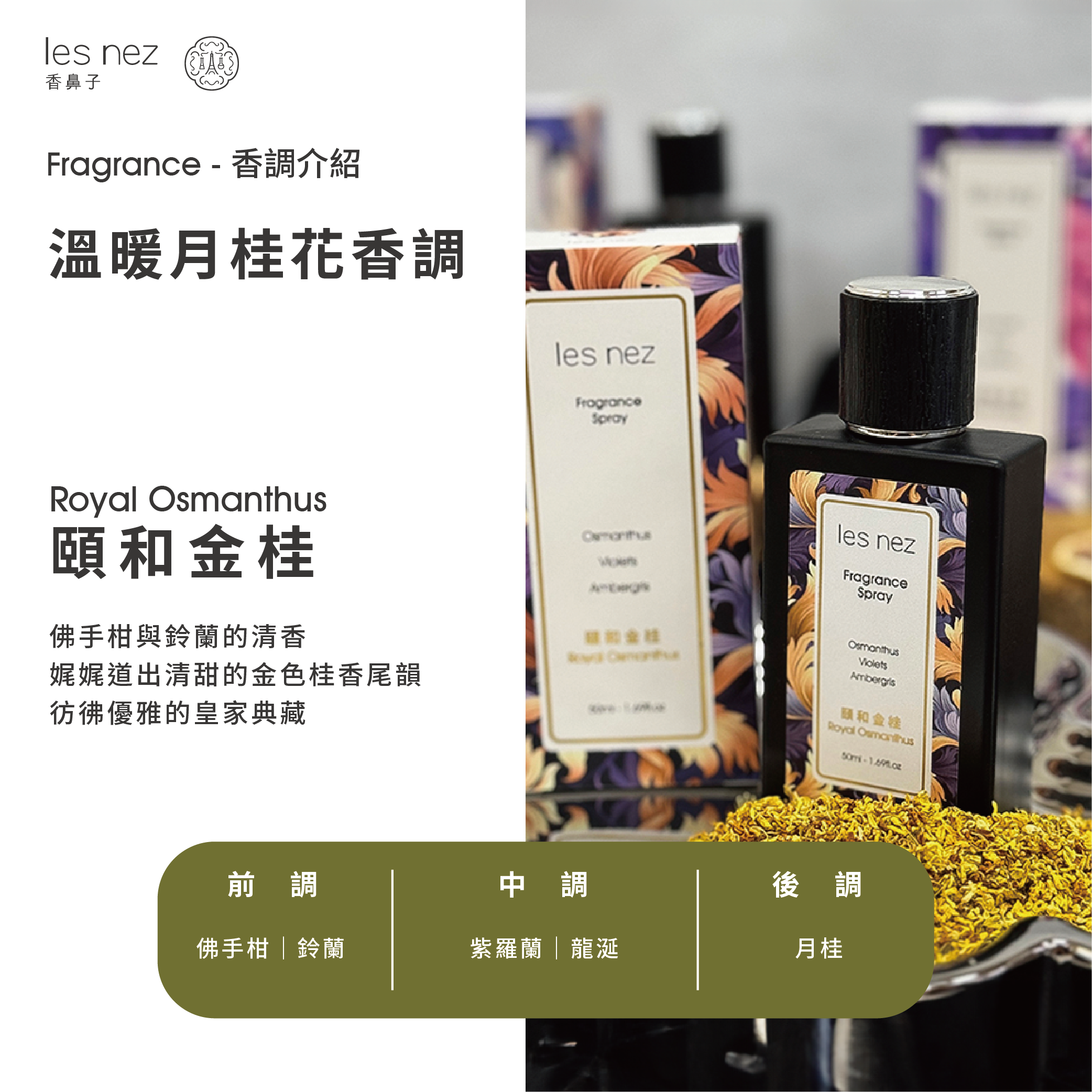 彷如一場秋日午後的優雅漫步,前調的佛手柑與鈴蘭散發清新而優雅的氣息。隨著紫羅蘭的溫潤芳香和龍涎香的高貴氣息慢慢浮現,整個空間逐漸被細膩的香氣包覆。後調的清香與金桂則帶來溫暖而甜美的餘韻,讓人心神安定。