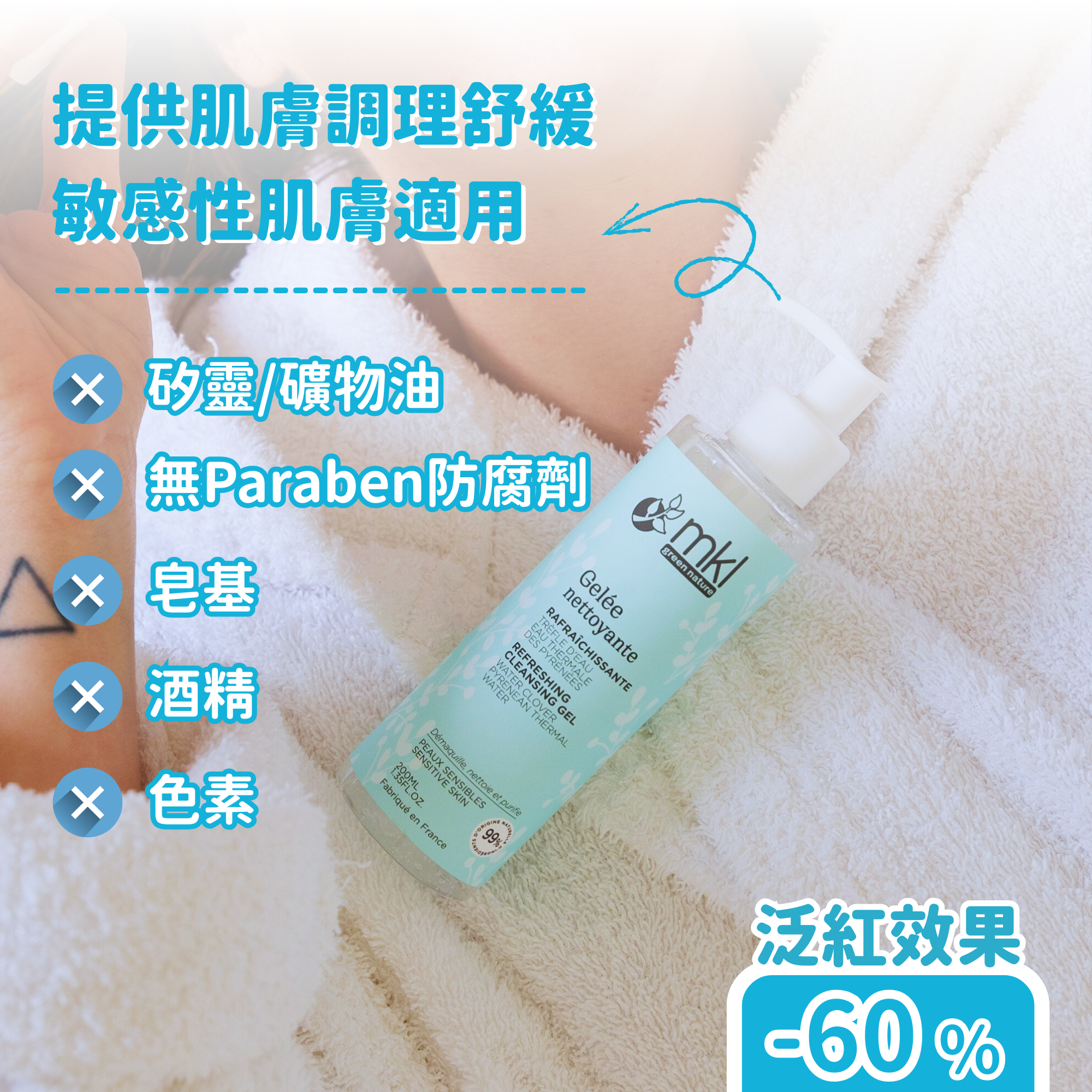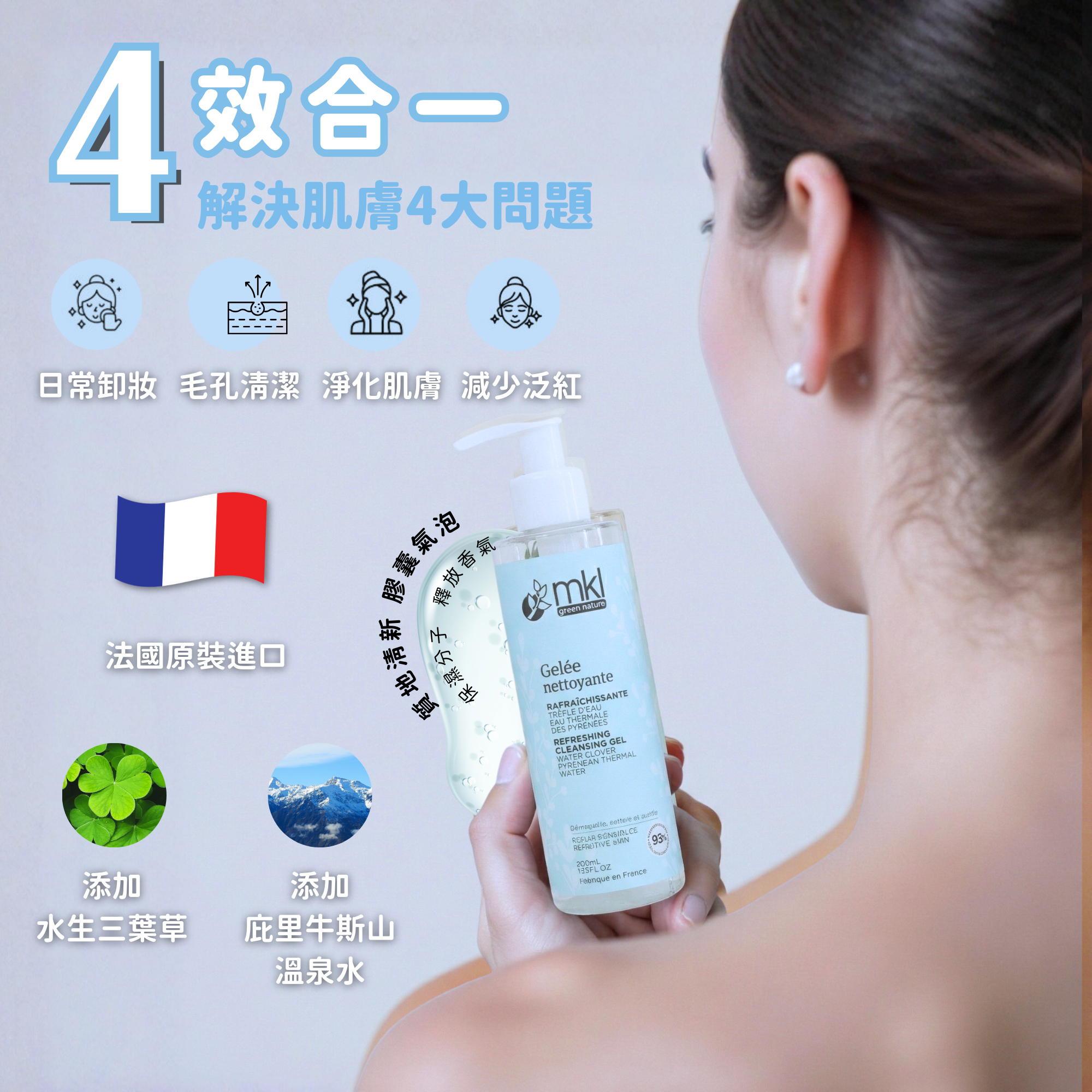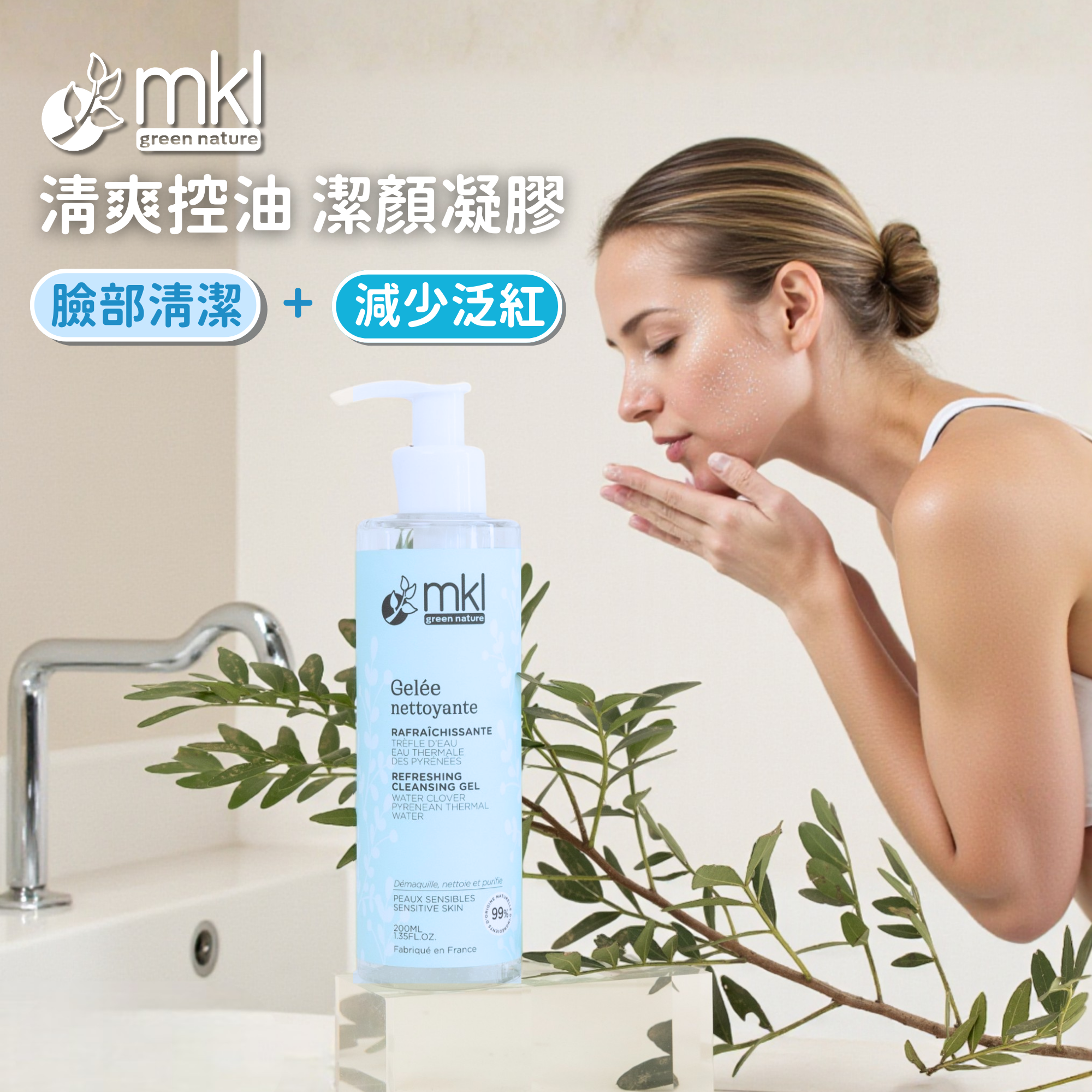 MKL清爽控油潔顏凝膠,比利牛斯山溫泉水+水丁香萃取,凝膠質地深層清潔又不緊繃,