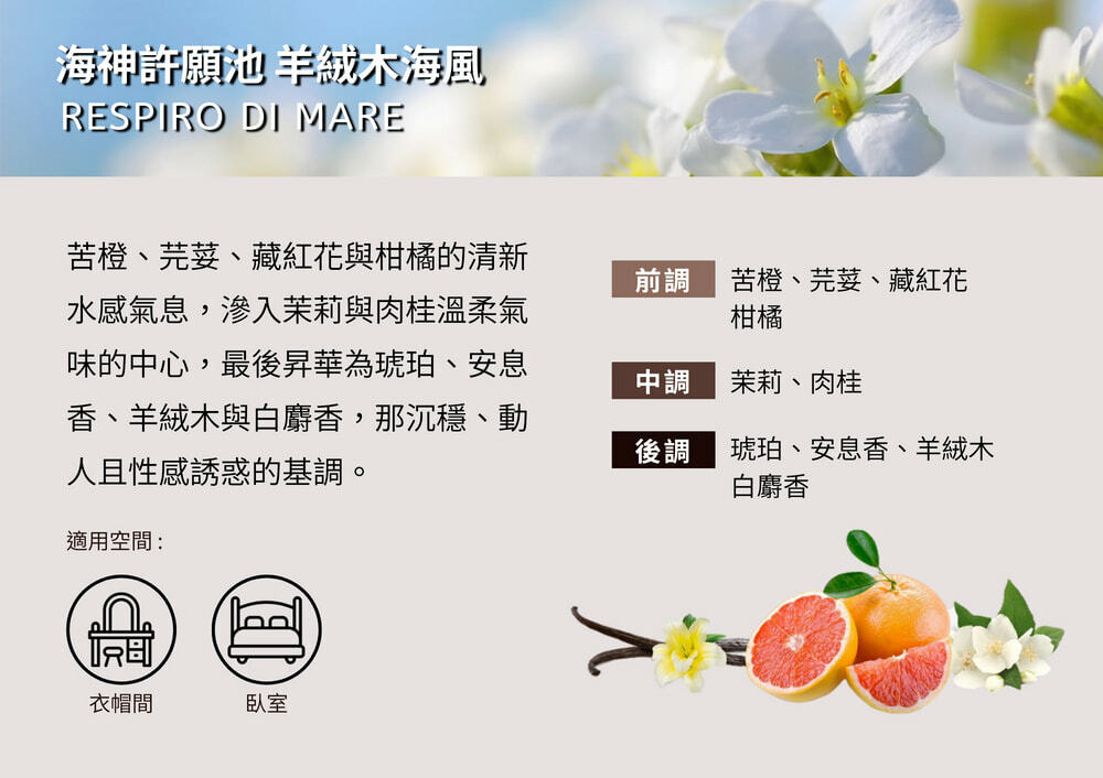 這款兼容並蓄如海洋般的香水,呈現出苦橙、芫荽、藏紅花與柑橘的清新水感氣息,隨之滲入茉莉與肉桂溫柔氣味的中心,呼應著許願池上方的四季女神,芬芳均衡且優雅浪漫。隨著時間的流動,香氣再次昇華為琥珀、安息香、羊絨木與白麝香,那沉穩、動人且性感誘惑的基調,如同波塞頓的無邊際海洋,散發出令人難以置信的強大平衡包覆感。